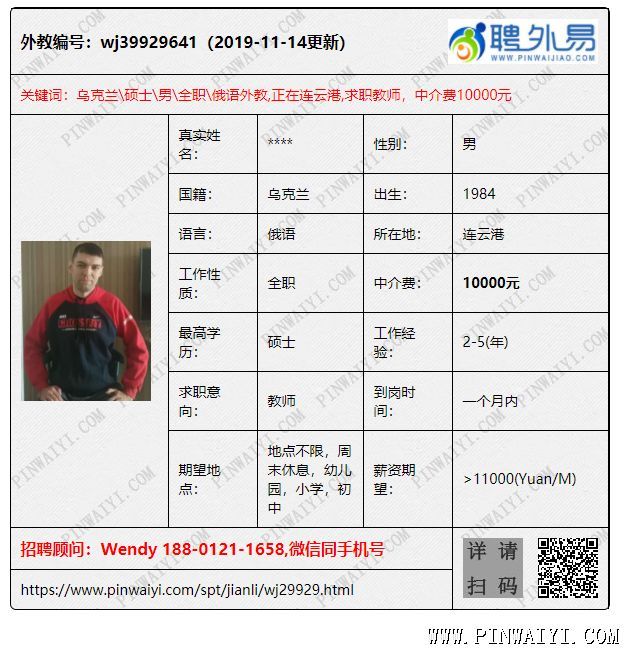 Maria+乌克兰美女+英语教师专业本科+2年中国教学经验,曾4次去美国参加体育项目,也到过波兰+管理类工签转聘+求职北京幼儿园+目前在北京,2020.1月初到岗~发音好,形象好 Jonny+乌克兰男+硕士,有TESOL+俄语老师教学类工签转聘+求职地点不限,周末休息,幼儿园,小学,初中都有教学经验+目前在连云港,12月到岗~发音很好,教学经验丰富 以上就是今天小编推荐的外教啦! 如果没有您看上的,可以打开我们的外教库,有海量外教供您选择! 您也可以直接发送招聘需求给我们,我们会根据您的要求为您精心挑选外教! |