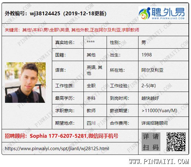 我们中国的教师在从事这个职业之前,也是需要接受教师相关的教育,需要先学习一些教育知识与能力和教育心理学相关的知识,在进行考试,考试合格后才可以从事教师行业。外国人想要来中国做外教也是需要相关的教育要求,必须自己先具备一定的教学能力和拥有相关的教育知识后才可以进行英语教学。所以一名合格的外教一定要有相关的受教育经历,比如外教可以是大学里主修教育学,语言专业的,这样能够更好的帮助学生学好英语知识。 近期正在求职的外教: