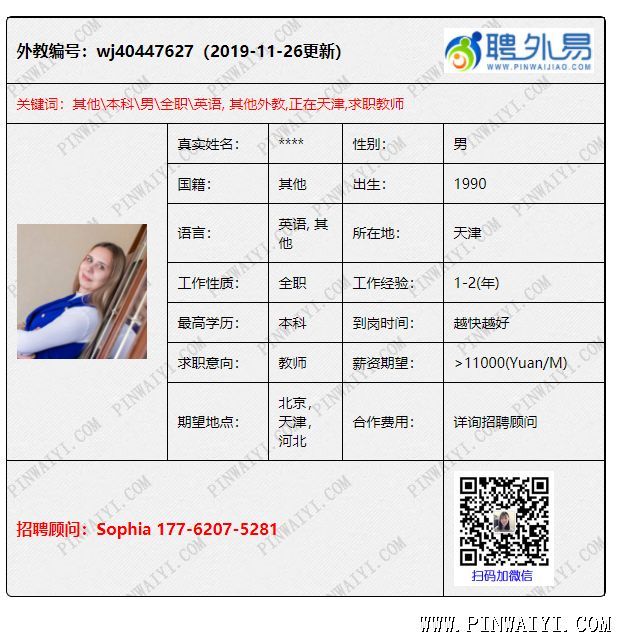 大家好!相信大家对我们的外教都很感兴趣,想要更深一步的了解我们的外教学历和个人情况,那么小编就来满足你们的愿望啦,我会每天都为大家推荐一些优质的外教,每天哦!有需要的老师要多多关注专题频道,相信总有一个外教适合你的学校!话不多说,开始推荐! 工签资料齐全,现在青岛,求职地不限,需要一个所学校能接受两个。 教学经验3年以上,发音标准,现于济宁,有商务签和工签资料,求职较大城市,和男朋友一起,可以接受一个城市不同学校,15-16k 工作经验丰富, 到校快, 可以到校面试, 形象好, 喜欢小朋友 爱尔兰, 在北京亦庄, 最好亦庄附近 , 工签转在12月,求职亦庄附近职位位。 培训班可以 工签资料齐全,求职深圳职位,可以尽快上岗。 以上就是今天小编推荐的外教啦! 如果没有您看上的,可以打开我们的外教库,有海量外教供您选择! 您也可以直接发送招聘需求给我们,我们会根据您的要求为您精心挑选外教! |