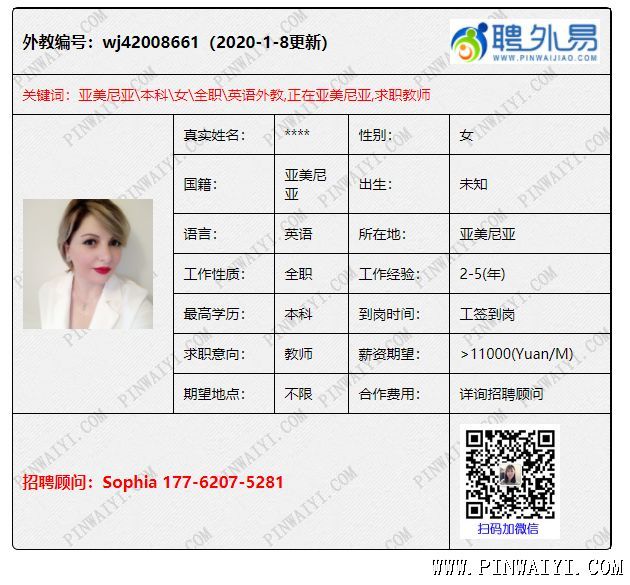 大家好!相信大家对我们的外教都很感兴趣,想要更深一步的了解我们的外教学历和个人情况,那么小编就来满足你们的愿望啦,我会每天都为大家推荐一些优质的外教,每天哦!有需要的老师要多多关注专题频道,相信总有一个外教适合你的学校!话不多说,开始推荐! nadia rahmani+摩洛哥女+英语专业本科,有TEFL+工签资料齐全+求职地点不限+目前在本国,办好工签到岗 口音好,到岗快,现在上海, 可以到校面试 摩洛哥男,在国外,TESOL,尽快到岗,英语学士学位,TESOL,工签到岗,与女朋友摩洛哥女,在国外,硕士(英语学士学位),俩人一个住宿,尽快到岗 亚美尼亚女,硕士(教育本科),家庭签(12月31)TEFL,14k+住宿,工签资料已经认证,2月10日到岗。 工签资料已经送大使馆,马上拿到,求职地不限。 以上就是今天小编推荐的外教啦! 如果没有您看上的,可以打开我们的外教库,有海量外教供您选择! 您也可以直接发送招聘需求给我们,我们会根据您的要求为您精心挑选外教! |