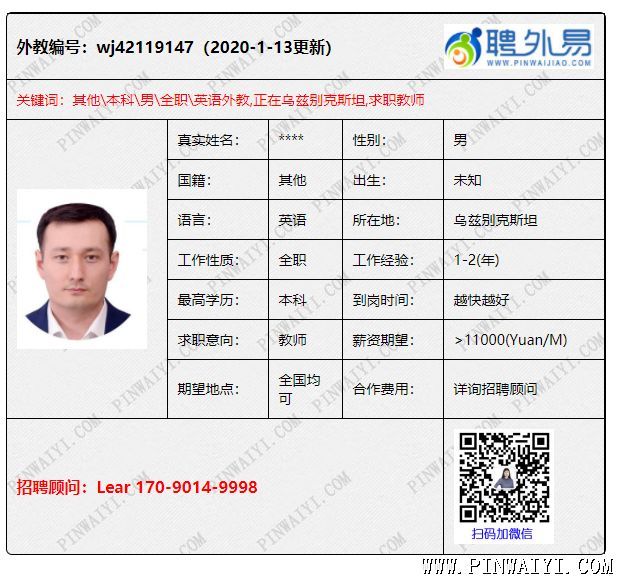 不是所有的英语发音好的外教都是好的外教,外教是教师职业的一种,他们的主要工作内容是教会学生知识,一个老师自己的知识再渊博,但是不会用合适的教学方法传授给学生,那么合格老师也不能称为一个优秀的老师,所以优秀的外教不仅要有标准的英语发音和渊博的英语知识以外,(查看新西兰外教)还要有适合中国学生的教学方式,帮助学生可以提升对英语的学习兴趣,引导学生开始主动学习英语,甚至使一些原本不喜欢学习英语的同学,认为自己没有学习英语的天赋,一提到英语就发愁的学生,开始变得有自信,开始喜欢上学习英语,这样的外教才是真正的好外教。 近期正在求职的外教: |
