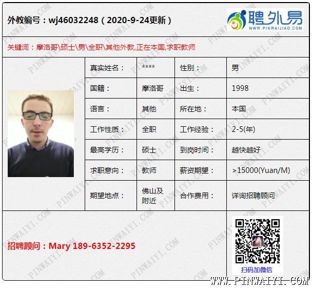 外教招聘快讯:每日外教推荐2020年9月26日 文学学士学位,主修英语语言和文学,自理学生签(2021.09),正在湖南,求职地点不限 南非外教,本科外教,tefl+文教类工签转(2021.07),正在昆山,求职上海幼儿园 本科外教,文教类工签转聘,正在武汉,求职幼儿园职位 乌克兰外教,自理商务签(11月),之后拿到结婚签,5年中国教学经验,正在深圳,求职深圳或珠海外教,10月底到岗,至少20全包,有住宿最好 摩洛哥外教,英语相关专业硕士,工签资料齐全,求职佛山或附近,目前在本国,发音很好 墨西哥外教,硕士外教,私人事务签,求职上海外教 南非外教,现在学生签,可以准备工签资料,正在重庆,求职地点不限 印度外教,硕士外教,1-2年工作经验,管理工签转聘,求职厦门外教 (编辑:Lisa) |