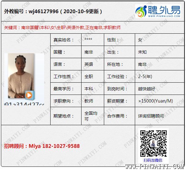 南非外教,2-5年工作经验,工签资料齐全,全国各地均可
