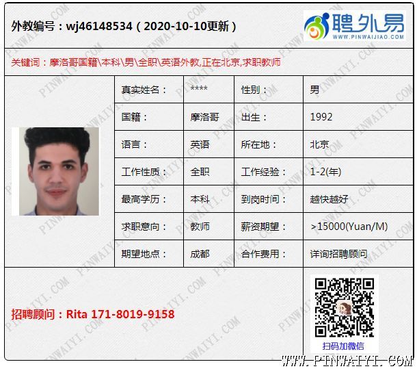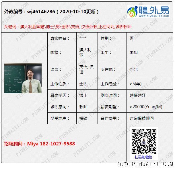 外教招聘快讯:每日外教推荐2020年10月12日 南非外教,1-2年工作经验,创业签证,正在成都,求职成都外教 本科外教,1-2年工作经验,正在北京,求职成都外教 菲律宾外教,1-2年工作经验,工签资料齐全,正在香港 化学相关专业博士,家庭签,在河北,求职南方高中职位(最好在福州),可以教化学,经验丰富 本科外教,正在深圳,求职深圳外教 双硕士学位,5年经验,Q1签证2年后到期,目前在北京隔离中,求职成都或附近城市的工作,薪资18K 英国外教,兰开斯特大学学士学位,哈尔滨大学语言本科,会汉语,目前考虑北京杭州等城市职位 喀麦隆外教,硕士外教,学生签2020.12.23,有工签材料,目前在吉林,3年经验 (编辑:Lisa) |