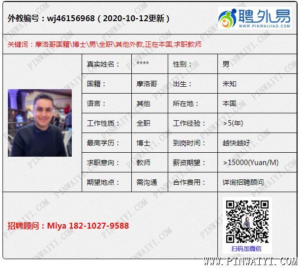 外教招聘快讯:每日外教推荐2020年10月13日 亚美尼亚外教,双本科,英语+音乐专业,工签转聘(12月底转聘),有经验,薪资17起,可以教音乐 南非外教,本科,法律tefl,在北京有小学经验,目前在南非,求职可以办理工作签的学校 亚美尼亚外教,居留许可到2020年6月,求职武汉幼儿园工作,薪资协商 本科媒体专业,硕士电影专业,政治科学博士学位,家属签,目前在隔离中,求职大学、高中培训班,职位薪资协商 英语和俄语专业本科,自理工签(2021.02),求职上海,10月13来中国,隔离两周后工作 硕士,tefl,工签资料齐全,求职深圳或者厦门,目前在本国,有两年以上推荐信,教学经验十分丰富 硕士,工签资料还差无犯罪,求职地点可协商(14~15+住宿或补贴) 博士外教,5年以上工作经验,正在本国,求职地需沟通 (编辑:Lisa) |