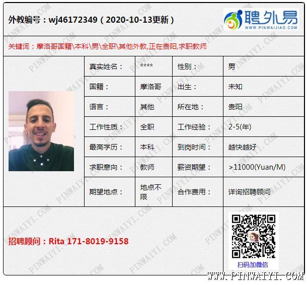 摩洛哥外教,本科,自理学生签(2021.01),准备好工签资料办工签,目前在贵阳