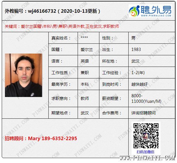 爱尔兰外教,1-2年工作经验,求职武汉的兼职工作