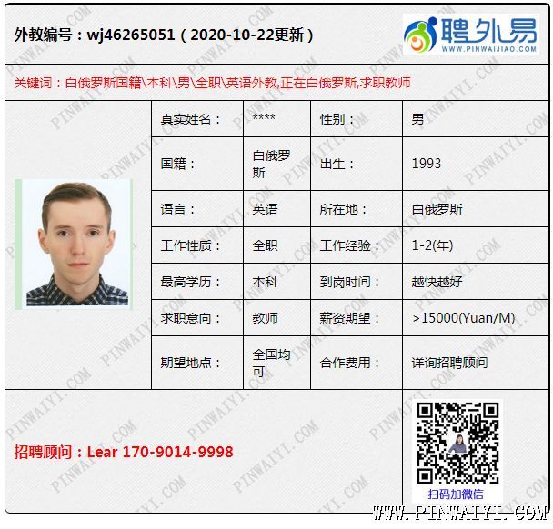 俄罗斯外教,2-5年工作经验,预计12月左右到岗