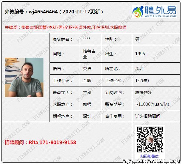 外教形象非常好,口音也不错,有两年教学经验,求职深圳幼儿园