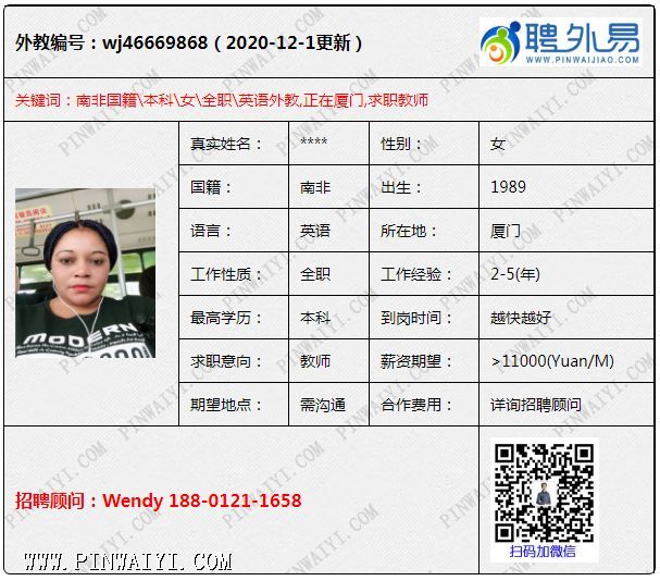 南非外教,本科外教,英国文学学士,在厦门