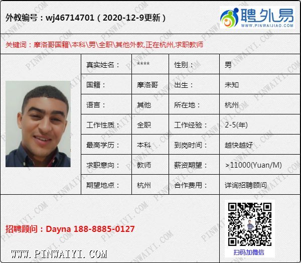 摩洛哥男,本科,自理学生签(2021.09),求职杭州,目前在杭州
