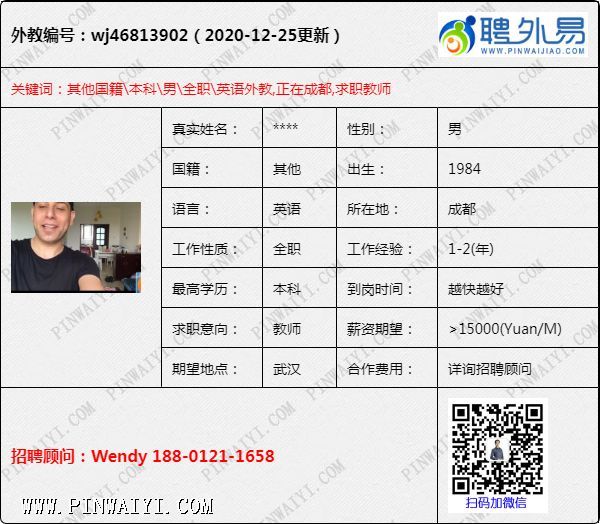 本科外教,工签资料齐全,在成都,求职武汉职位
