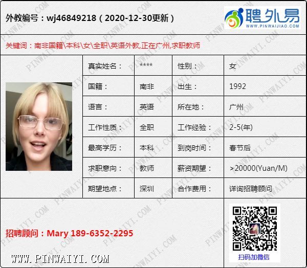 南非女,本科,求职深圳,目前在广州,春节后到岗,学过戏剧