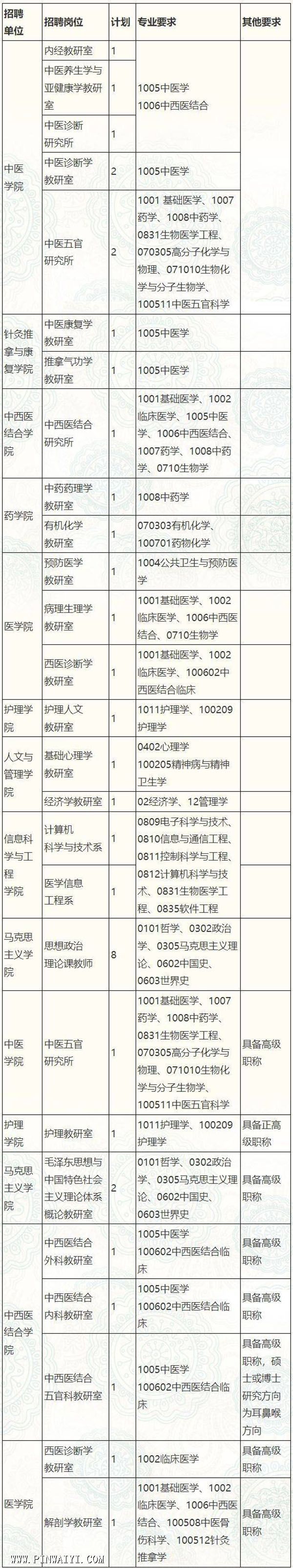 学校秉承“文明、求实、继承、创新”的校训精神,坚持“质量办学、特色办学、开放办学”的理念,坚持立足湖南、服务全国、面向世界,全力实施“人才强校”战略,倾力打造高水平师资队伍,真诚期待优秀人才的加盟,共创湖南中医药大学的美好未来! 一、引进人才类型 (一)杏林杰出人才:已取得重要研究成果、在国内外有重要学术影响、引领学科发展的专业技术人才。年龄一般不超过65周岁(1958年1月1日以后出生)。 (二)杏林领军人才:有较高学术造诣、在国内外有一定学术影响力的专业技术人才。具备正高级职称,年龄一般不超过55周岁(1968年1月1日以后出生)。 (三)杏林拔尖人才:学术基础扎实、有一定的学术造诣和较强创新能力的中青年专业技术人才。具备正高级职称,自然科学类人选年龄不超过45周岁(1978年1月1日以后出生),人文社科类人选年龄不超过47周岁(1976年1月1日以后出生)。 (四)杏林骨干人才:有良好的学术基础、较强创新能力和发展潜力的青年专业技术人才。具备博士学历或高级职称,自然科学类人选年龄不超过40周岁(1983年1月1日以后出生),人文社科类人选年龄不超过42周岁(1981年1月1日以后出生)。 (五)杏林青苗人才:有良好发展潜力,有较强的教学科研素质和团队协作精神的优秀博士。自然科学类人选年龄不超过33周岁(1990年1月1日以后出生),人文社科类人选年龄不超过35周岁(1988年1月1日以后出生)。 (六)专业骨干人才:西医诊断学、解剖学、中西医结合内科、中西医结合外科教研室等急需紧缺专业及课程建设骨干人才。具备博士研究生学历、高级职称以及相关专业教学或临床工作经历,原则上年龄不超过45周岁(1978年1月1日以后出生)。 (七)专项博士:有较强创新能力和发展潜力的青年博士。年龄一般不超过35周岁(1988年1月1日以后出生)。 二、引进计划及要求 (一)杏林杰出人才、杏林领军人才、杏林拔尖人才招聘计划不受限制,鼓励带领所属团队来校工作。 (二)专业骨干人才:9名,可根据个人综合能力和水平,对接杏林骨干及以上人才。 (三)专项博士计划:28名,可根据个人综合能力和水平,对接杏林骨干人才、杏林青苗人才。 (四)专项博士与专业骨干人才招聘要求