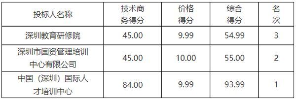 四、 候选中标供应商: 中国(深圳)国际人才培训中心、深圳市国资管理培训中心有限公司、深圳教育研修院 五、 中标(成交)信息 中标供应商名称:中国(深圳)国际人才培训中心 中标供应商地址:深圳市福田区华富街道福中路17号国际人才大厦 中标(成交)价格:人民币大写伍拾贰万元整(¥520000.00) 六、 主要标的信息:
