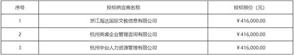四、候选中标供应商名单: 浙江海达国际文教信息有限公司 杭州中台人力资源管理有限公司 杭州英睿企业管理咨询有限公司 五、中标信息 供应商名称:浙江海达国际文教信息有限公司 供应商地址:浙江省杭州市凤起路334号1209室 中标金额:人民币肆拾壹万陆仟元整(¥416,000.00) 六、主要标的信息: