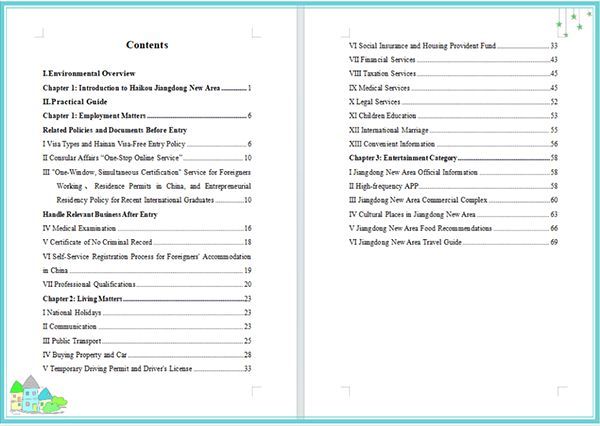 All the foreign friends in Haikou Jiangdong New Area, come and take a look! Have you encountered any of these questions? What information do you need to provide after arriving in Hainan? What preparations are required for starting a business or seeking employment in Hainan? How much do you know about the lifestyle and entertainment facilities in Jiangdong New Area? 为此,海口江东新区管理局为您量身定制 《海口江东新区外籍人才服务指南》 专属服务、触手可及 拿好手里的“指南针” 一起开启全新的江东旅程! For this purpose, the Haikou Jiangdong New Area Management Bureau has tailored the "Haikou Jiangdong New Area Expat Talent Service Guide" for you! Take exclusive Services, at your Fingertips. Hold onto your "compass" and embark on a brand-new journey in Jiangdong! 01 指南内容介绍Guide Content Overview 《海口江东新区外籍人才服务指南》分为环境综述、实用指南两大板块,涉及如何办理工作签证、住宿登记、体检认证、来华工作许可证、居留许可证以及购房购车、医疗教育等多方面,以清晰、便捷、可视化的方式全面提供园区外籍人才工作、生活及娱乐所需的实用政策性信息和服务资讯,目前,该指南已在江东e企惠平台线上发布。