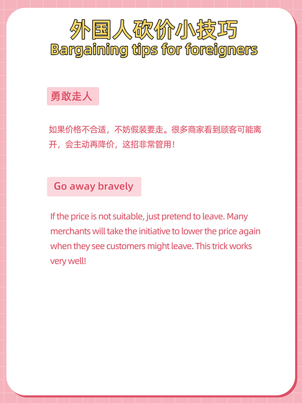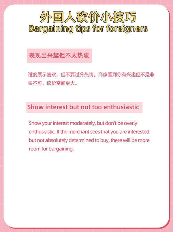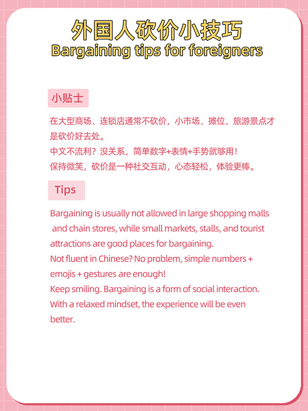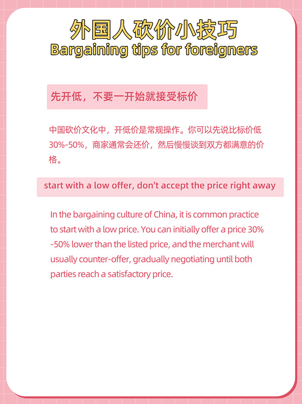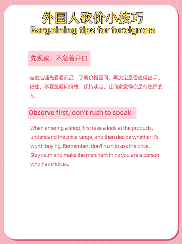在中国购物,砍价其实也是一种文化体验。学会了这几招,你也能像本地人一样,买得开心又省钱! Shopping in China, bargaining is actually a cultural experience. By learning these tricks, you can also enjoy shopping happily and save money like a local! 外国人来中国必学第一招:砍价! |