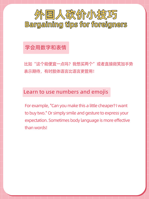 外国人来中国必学第一招:砍价! 初到中国的外国朋友,很多人都被一句话惊到:“价格可以谈哦” 是的,你没听错,中国的购物文化里,砍价几乎是标配技能,不管是市场小店还是一些旅游景点,学会砍价不仅能省钱,还能体验当地生活乐趣! For foreign friends who have just arrived in China, many are taken aback by the phrase: "Prices are negotiable." Yes, you heard it right. In China's shopping culture, bargaining is almost a standard skill, whether it's in small market stalls or some tourist attractions. Learning to bargain can not only save money, but also experience the local lifestyle!