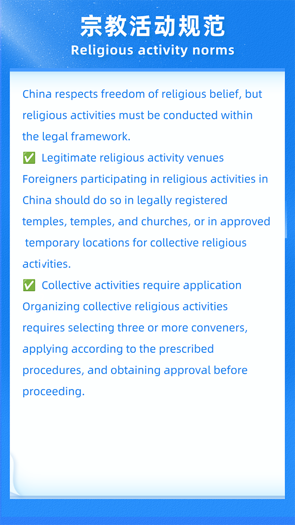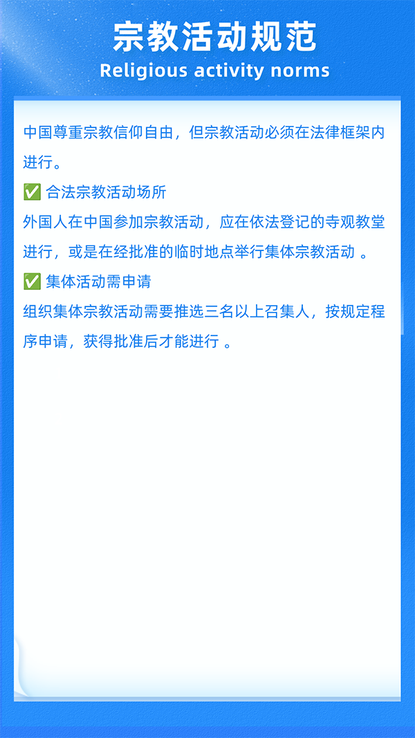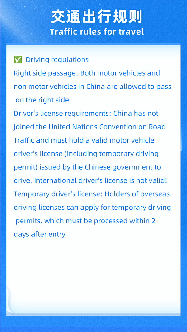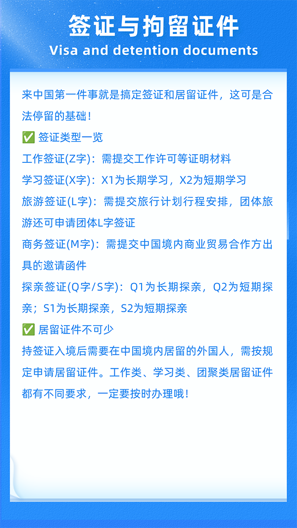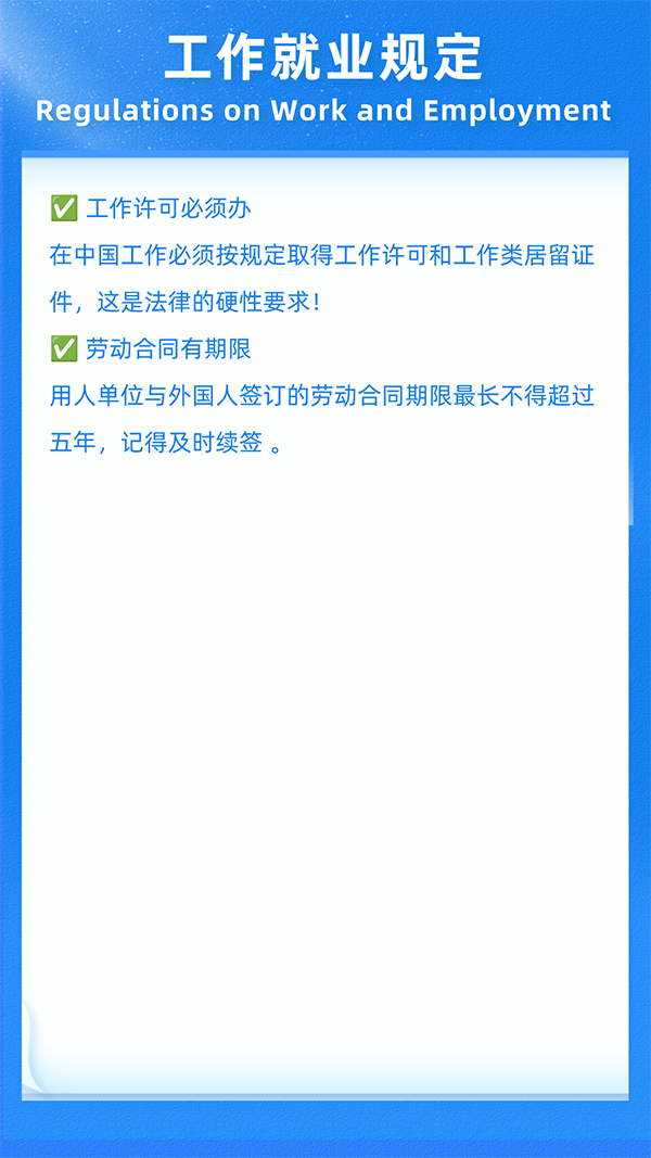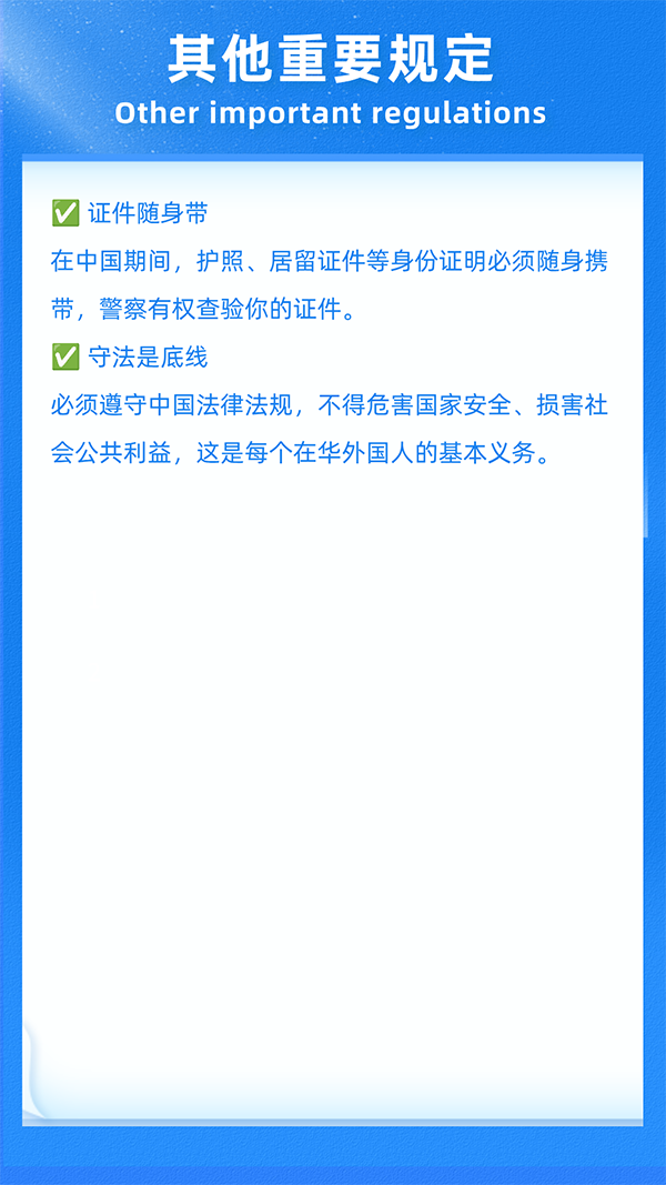 温馨小贴士 证件遗失、损毁、被盗抢要及时向公安机关申请补发; 签证停留期限可以申请延期,但累计延长不得超过原签证期限; 申请各类证件时材料不符合要求,工作人员会一次性告知需要补正的内容。 Warm Tips Lost, damaged, or stolen documents should be promptly applied for reissue to the public security organs; The visa stay period can be extended, but the cumulative extension shall not exceed the original visa period; When applying for various types of documents, if the materials do not meet the requirements, the staff will inform you of the necessary corrections in one go. 希望这份攻略能帮你更好地适应中国的生活!中国是个法治国家,只要遵纪守法,你会发现这里既安全又便利,人民友善,生活精彩! I hope this guide can help you better adapt to life in China! China is a country governed by the rule of law. As long as you abide by the law, you will find that it is both safe and convenient here, with friendly people and wonderful life! 外国人来华,这些法律法规要知道 |
