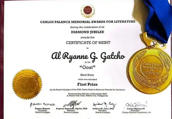 文章来源:岳阳日报 湖南理工学院外教用“羊”征服菲律宾“普利策奖” 洞庭波涌,一纸喜讯越洋而来。近日,在2025年度菲律宾卡洛斯·帕兰卡纪念文学奖评选中,38岁的湖南理工学院外国语言文学学院菲律宾籍教师(外籍人才)阿尔·莱恩·G·加乔(Al Ryanne G. Gatcho)(以下简称莱恩),将一则关于半人半羊的哀伤故事,化作一篇跨越文化的英文短篇小说《山羊》,一举夺得短篇小说类别一等奖。 卡洛斯·帕兰卡纪念文学奖被誉为“菲律宾普利策奖”,自1950年创立以来,始终是菲律宾文学界最高荣誉的象征。11月26日,莱恩赴菲律宾马尼拉出席颁奖典礼,捧回了获奖证书——这位日常站在讲台上的“外国先生”,竟以笔为舟,驶向了国际文学的高地。