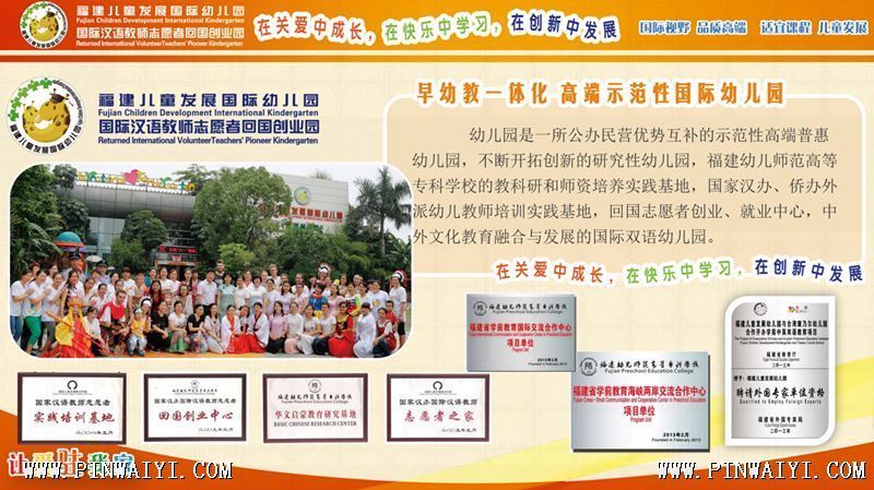 福建儿童发展国际幼儿园创办于2011年5月,地处福州市仓山区金山公园东侧美林湾楼盘内,是福建幼儿师范高等专科学校国际汉语教师志愿者回国创业园、教科研和师资培养实践基地;是国家汉办、侨办外派幼儿教师培训实践基地,福建省学前教育闽台合作办学项目基地;是一所公办民营优势互补、中外文化教育融合与发展的早幼教一体化高端示范性国际双语幼儿园;幼儿园拥有一支从海外回国稳定的中籍保教团队和富有国际视野和观念的优秀外籍教师团队,幼儿园办园形式多样化,课程模式多元化,教育幼儿个性化,对外交流国际化,坚持以幼儿发展为本,以改革创新为动力,以提高保教质量为核心,融合公民办优势,始终立足国际视野、创造适宜教育,把培养幼儿身心健康、全面和谐富有个性发展的孩子作为幼儿园一切工作的出发点和归宿,让每个孩子在关爱中成长,在快乐中学习,在创新中发展。