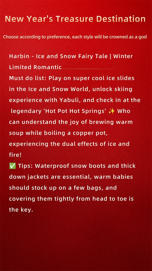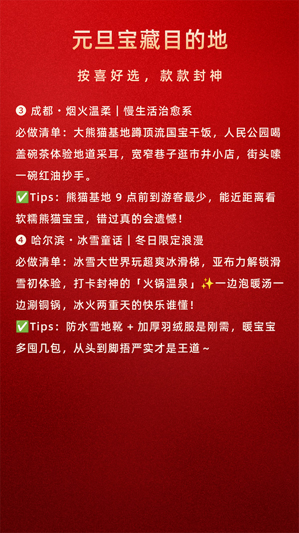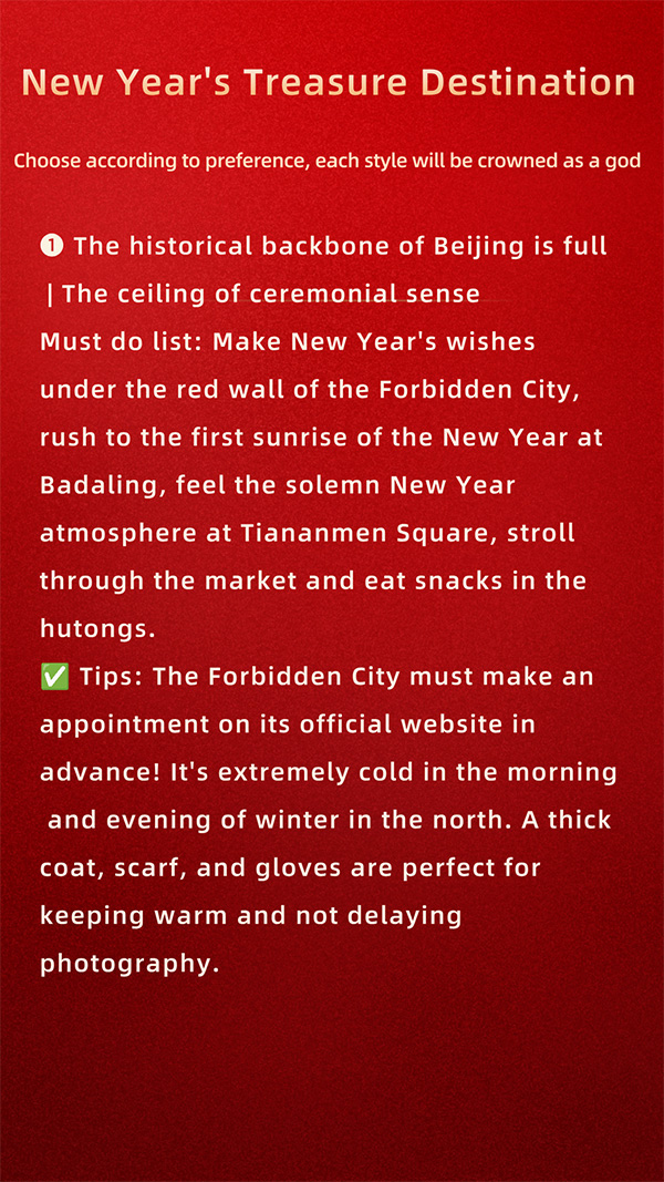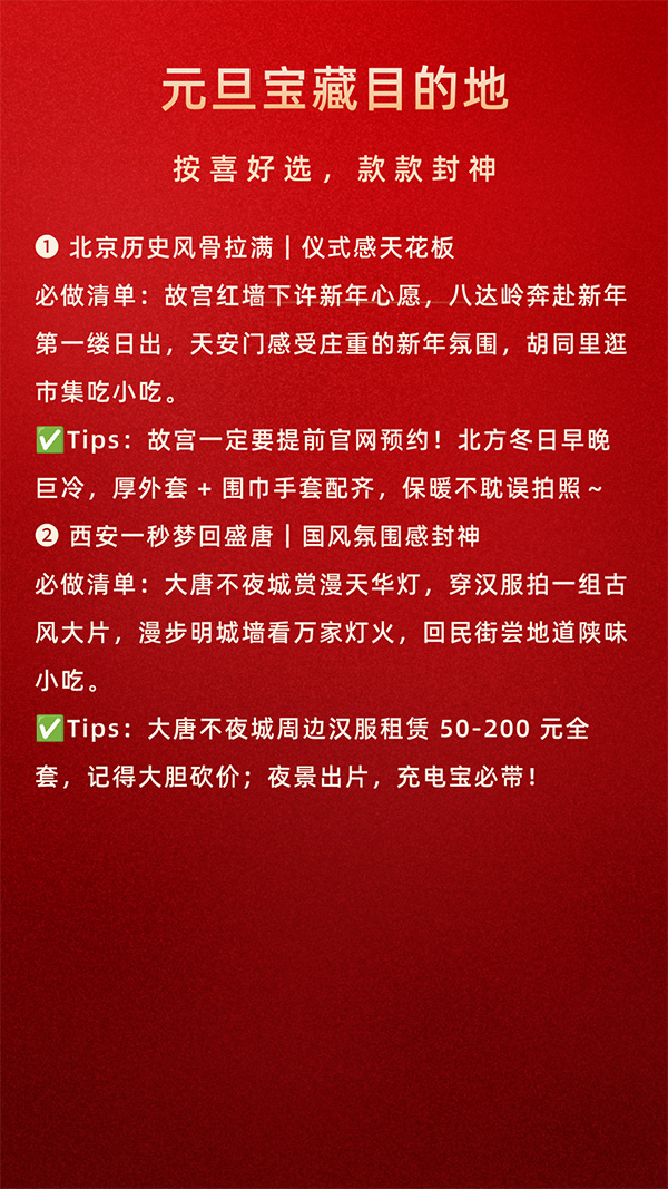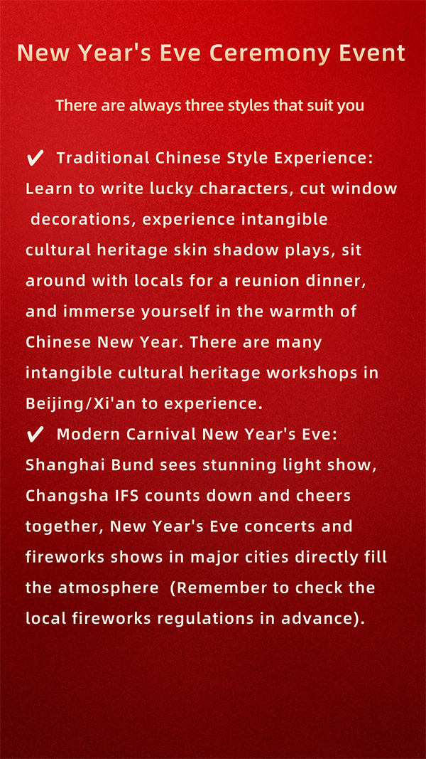 答案真的超惊艳!在中国过元旦,你能同时拥有千年东方的浪漫仪式感+摩登都市的狂欢氛围感,厚重文化碰撞新潮玩法,不管偏爱热闹还是安静,都能狠狠拿捏难忘的跨年体验,这份超全攻略闭眼冲,全程不踩雷! The answer is really amazing! On New Year's Day in China, you can experience both the romantic ceremony of the millennium East and the carnival atmosphere of a modern city. With a collision of rich cultures and trendy gameplay, whether you prefer liveliness or quietness, you can firmly grasp the unforgettable New Year's Eve experience. This comprehensive guide covers the whole journey without stepping on thunder! 在中国的元旦,从来都不止一种打开方式。可以在红墙古巷里感受千年文化的厚重,也能在霓虹街头拥抱热闹的跨年狂欢;可以奔赴一场冰雪童话,也能沉浸在温柔的烟火人间。 On New Year's Day in China, there is never just one way to open it. You can feel the weight of millennium culture in the Red Wall Ancient Alley, and embrace the lively New Year's Eve celebration on the neon streets; You can go to a fairy tale of ice and snow, or immerse yourself in the gentle world of fireworks. 这份独有的中式浪漫,藏着中国人对新年的美好期许,也藏着最鲜活的东方风情。 This unique Chinese romance hides the beautiful expectations of Chinese people for the New Year, as well as the most vivid Eastern style. 元旦将至,约上小伙伴一起奔赴这场跨年盛宴吧,在中国,解锁独一无二的新年快乐~ New Year's Day is approaching, let's go to this New Year's Eve feast with our friends. In China, unlock the unique joy of the New Year. 解锁中式跨年 外国人在中国的仪式感天花板 |